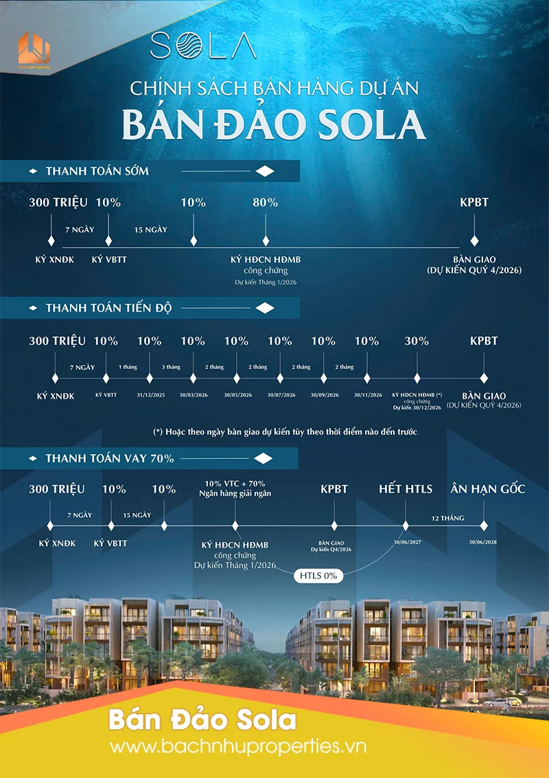 Chính sách bán hàng Bán Đảo Sola đang tạo nên cơn sốt trên thị trường bất động sản cao cấp cuối năm 2025, đầu năm 2026. Với 3 phương án thanh toán cực kỳ linh hoạt, đặc biệt là gói Hỗ trợ Lãi suất 0% kéo dài và ân hạn gốc đến 12 tháng, Masterise Homes đang mở ra cánh cửa sở hữu biệt thự đảo compound sola đảo ánh dương giữa trung tâm TP. Thủ Đức.
