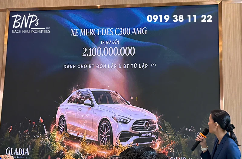 Đây là ưu đãi bùng nổ nhất và được mong chờ nhất. Khách hàng khi đăng ký sở hữu các sản phẩm Biệt thự Đơn lập & Biệt thự Tứ lập tại Gladia by the Waters sẽ có cơ hội nhận ngay một chiếc xe Mercedes C300 AMG sang trọng, trị giá lên tới 2.100.000.000 VNĐ.