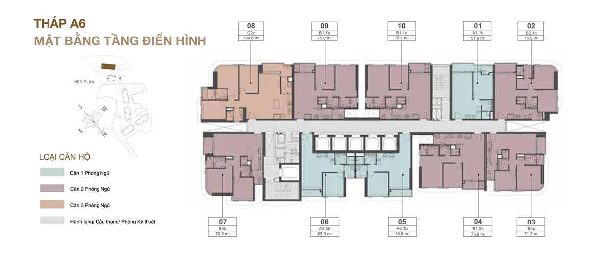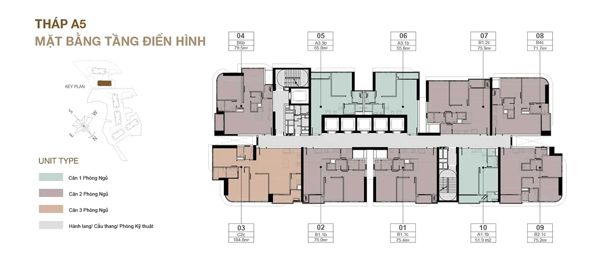 2PN: 74–80 m² – sản phẩm chủ lực, phù hợp gia đình nhỏ.