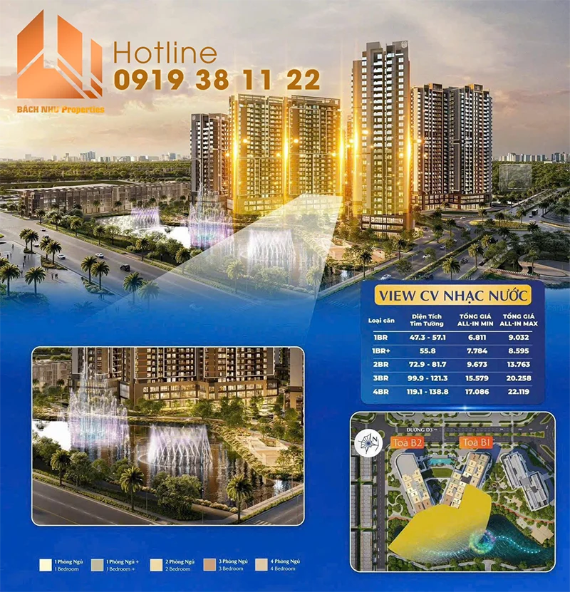 • Tài chính dưới 9 tỷ: Hãy tập trung vào các căn 1PN hoặc 1PN+ view nội khu hoặc view nhạc nước ở tầng thấp. Đây là dòng căn hộ “quốc dân”, dễ mua, dễ bán.