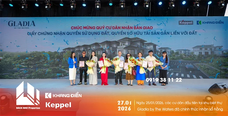Sự kiện Gladia by The Waters bàn giao sổ hồng vào ngày 25/01/2026 đã trở thành tâm điểm của thị trường bất động sản khu Đông TP.HCM. Trong bối cảnh khách hàng ngày càng khắt khe về tính pháp lý, việc liên doanh Keppel và Khang Điền thực hiện đúng cam kết trao sổ hồng chỉ sau hơn 3 tháng mở bán là một lời khẳng định đanh thép về uy tín và giá trị thực chất của dự án.