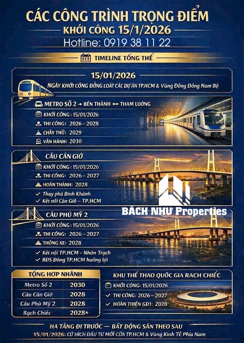 Giai đoạn 2026–2030 được xem là chu kỳ bùng nổ hạ tầng của TP.HCM khi nhiều công trình lớn dự kiến khởi công và hoàn thiện theo các mốc rõ ràng. Đây cũng là yếu tố có thể tạo “cú hích” tích cực cho thị trường bất động sản, đặc biệt là khu Đông – nơi dự án The Global City tọa lạc.