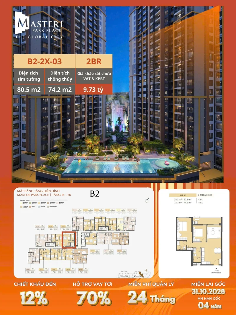 | Căn hộ Masteri Park Place 2PN (2BR) | B2-2X-03 | 74.2 m² | 80.5 m² | 9.73 tỷ |