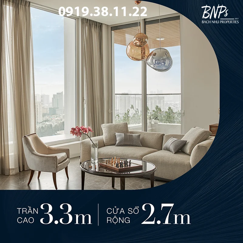 - Trần cao 3.3m: Đây là con số định hình một tỷ lệ không gian rộng mở. Độ cao này vượt xa tiêu chuẩn chung của các căn hộ cao cấp thông thường (thường chỉ từ 2.8m – 3m). Trần cao giúp luồng không khí lưu thông tốt hơn, biến sự thông thoáng trở thành một phần của phong cách sống.