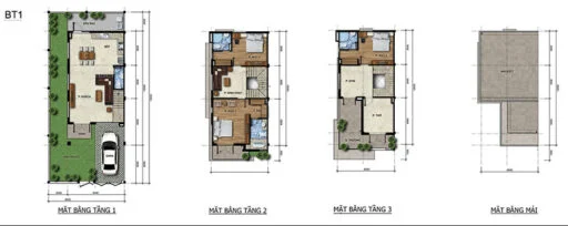- Thiết kế từ 1 trệt 2–3 lầu, đi kèm sân vườn rộng, gara đủ cho 2 xe, tạo không gian sống tiện nghi và thoải mái.